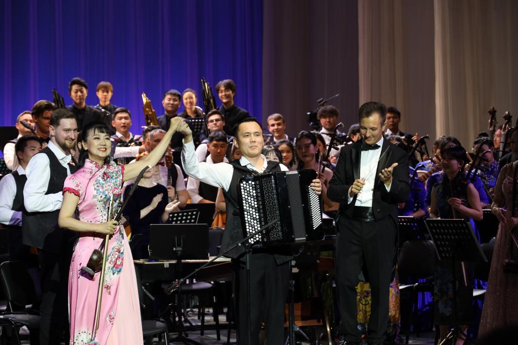 下半场,民乐系主任姜克美与巴扬演奏家弗拉基米尔·博亚尔斯基合作呈现中国作曲家张诗乐编曲的《龙的传人》,摇滚元素的加入给乐曲注入了全新的活力;宋飞演奏的《阳光照耀着塔什库尔干》(为二胡与乐队而作),以及俄罗斯民歌《雅库特之歌》、《卡林卡》主题即兴协奏曲、乐队《丝绸之路与世界》、中国传统曲目《金蛇狂舞》、返场曲目《花好月圆》等,将现场氛围推向高潮。