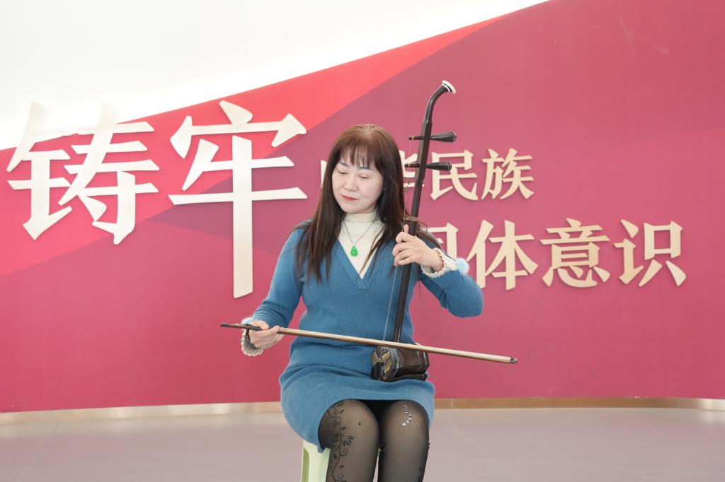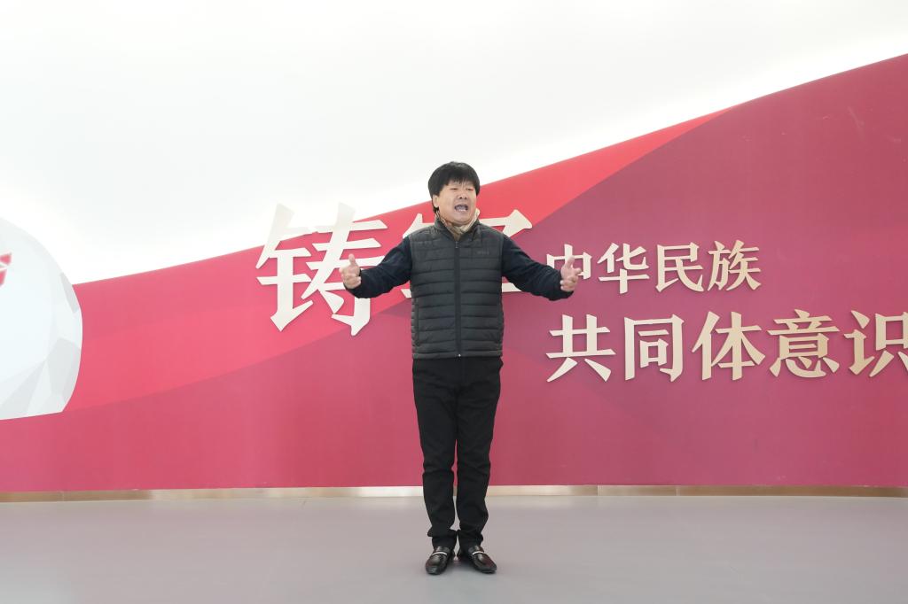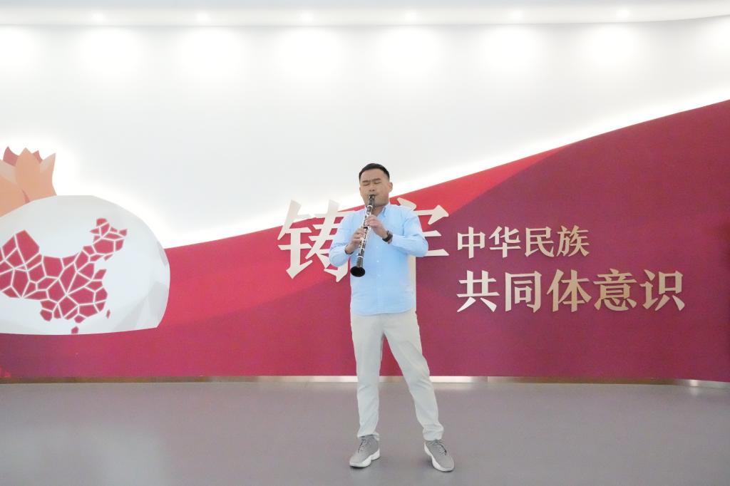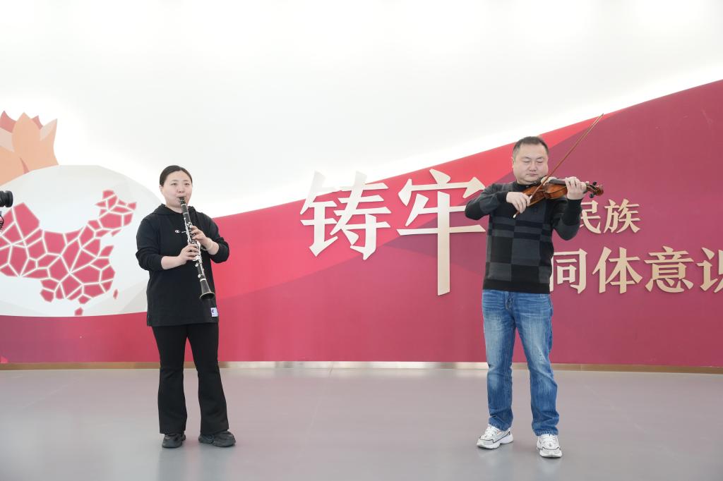 在黑龙江省中华民族共同体体验馆,教师们通过沉浸式的展览和互动体验,全面了解了中华民族多元一体的历史脉络与文化交融,深刻体会到各民族共同团结奋斗、共同繁荣发展的重要意义。参观过程中,教师们深受鼓舞,即兴表演了单簧管独奏《山丹丹花开红艳艳》、单簧管和小提琴合奏《我爱你中国》、二胡独奏《战马奔腾》和民歌独唱《新货郎》等节目,参观活动在“中华民族一家亲 同心共筑中国梦”响亮的口号声中结束。