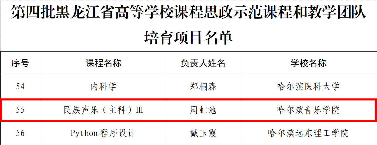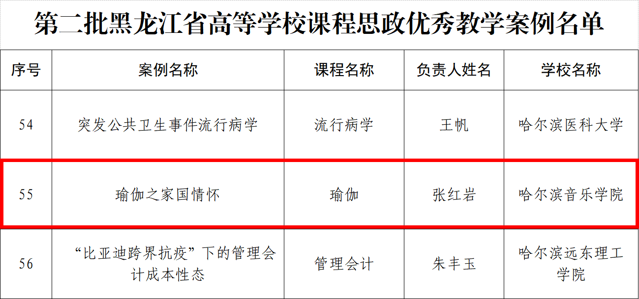 近日,省教育厅发布了《关于公布黑龙江高校第四批省级课程思政示范课程和教学团队培育项目及第二批省级课程思政优秀案例名单的通知》,学院民族声乐系教授周虹池申报的《民族声乐(专业主科)Ⅲ》荣获课程思政示范课程和教学团队,公共课教研室副教授张红岩申报的《瑜伽之家国情怀》荣获课程思政优秀案例。