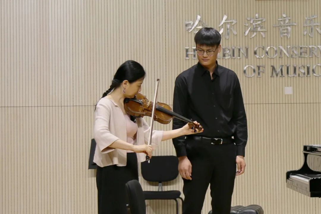 授课中,管弦系学生邓旗飞、李姝臻、张露尹、李博杨以弦乐四重奏形式演奏了舒曼《云雀》,邓旗飞、张域芹、林靖禹依次展示小提琴独奏曲目《巴赫fuga》《莫扎特第四协奏曲》《勃拉姆斯A大调小提琴奏鸣曲》。夏小曹分别从音乐方向感、声音传达、重奏演奏的技巧等方面给予个性化指导,并结合自身求学经历,着重强调了重奏过程中要注意彼此间的默契配合。她指出,在练琴的过程中要充分了解乐曲、音准及谱面等信息,既要提高对音乐的敏锐度,又要全身心地投入音乐世界。随后,她针对学生在演奏中出现的问题亲身示范,使现场师生获益良多。