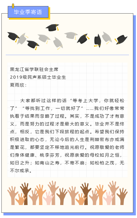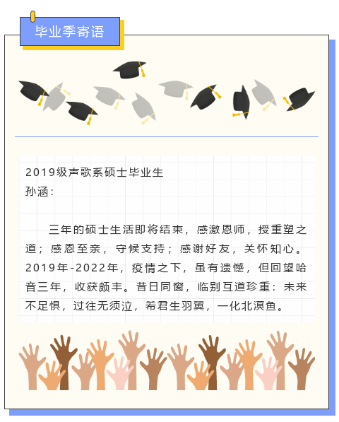 此去鲜衣怒马,热血不改从前;愿此生繁花似锦,归来仍是少年!希望2022届毕业生同学赓续哈音血脉,传承哈音精神,立足新时代的大舞台,在民族复兴的伟大历史进程中,以梦为马、莫负韶华,谱写人生壮丽的新篇章!毕业快乐!祝福你们!